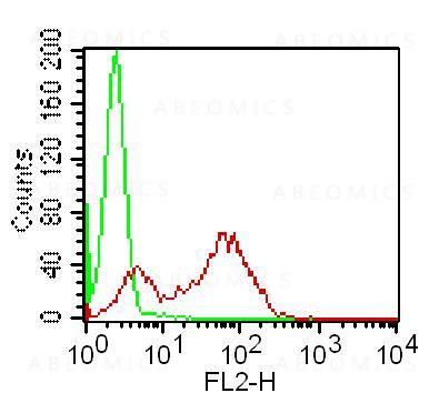 Fig-1: Intracellular flow analysis of TLR3 PE conjugated in human PBMC (lymphocytes) using 0.5 µg/10^6 cells of TLR3 PE conjugated antibody (Clone: ABM15D5). Green represents isotype control; red represents anti-TLR3 PE conjugated antibody.