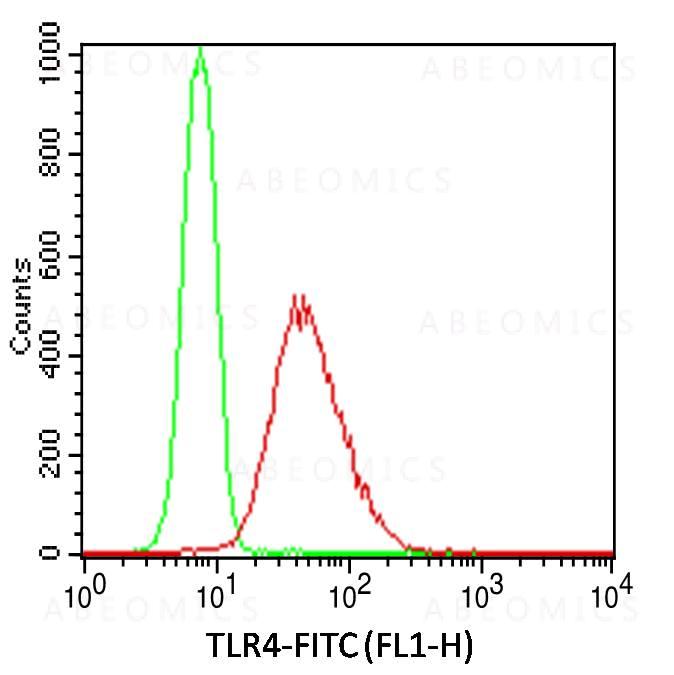 Fig-1:Intracellular flow analysis of hTLR4 antibody in Ramos Cell line using 2 µg/10^6 cells of hTLR4 antibody (Clone: HTA125). Green represents isotype control; red represents anti-hTLR4 antibody. Goat anti-mouse FITC conjugate was used as secondary antibody.