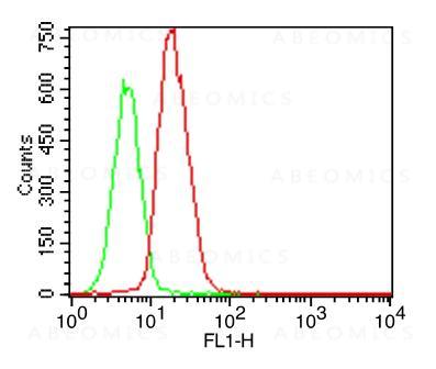 Fig-1: Intracellular flow analysis of hTLR5 FITC conjugated in hTLR5 transfected cell line using 0.5 µg/10^6 cells of hTLR5 FITC conjugated antibody (Clone: ABM22G1). Green represents isotype control; red represents anti-hTLR5 FITC conjugated antibody.