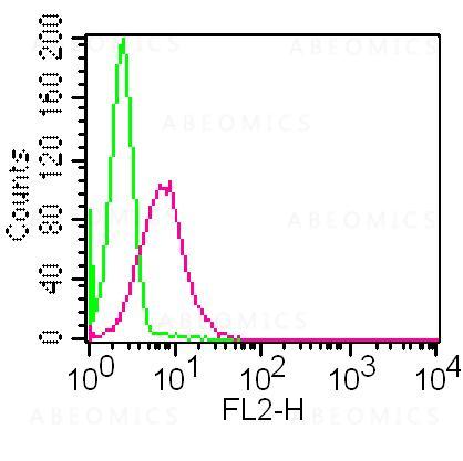 Fig-1: Intracellular flow analysis of TLR9 PE conjugated in hPBMC (Lymphocytes) using 0.5 µg/10^6 cells of TLR9 PE conjugated antibody (Clone: ABM1C51). Green represents isotype control; red represents anti-TLR9 PE conjugated antibody.