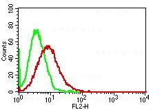 Fig:1- Intracellular Flow analysis of Topo II alpha antibody in Jurkat cells using 0.5 µg/ 10^6 cells of anti-Topo II alpha antibody (ABM48B4). Green represents isotype control;red represents anti-Topo II alpha antibody. Goat anti-mouse PE conjugate was used as secondary antibody.