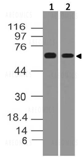 Figure-1: Western blot analysis of TRAF5. Anti-TRAF5 antibody (Clone: ABM12A2) was used at 2 µg/ml on A431 and A549 lysates.