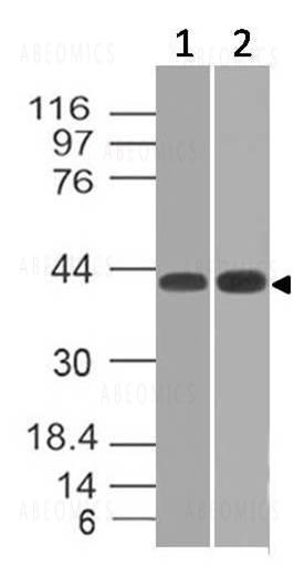 Figure 1: Western blot analysis of TSLP Receptor. Anti- TSLP Receptor antibody (Clone: ABM28B6) was tested at 2 µg/ml on (1) THP-1 and (2) human heart lysate.