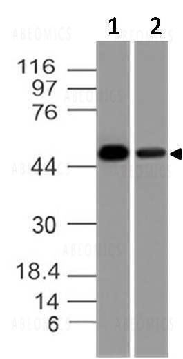 Fig:1- Expression analysis of Tyrosinehydroxylase. Anti- Tyrosinehydroxylase antibody (Clone: ABM51D7) was tested at 2 µg/ml on Ramos and PC3 lysates.