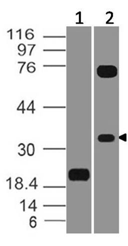 Figure:1- Western blot analysis of VISTA. Anti-VISTA antibody (Clone: ABM1F9.1F6) was tested at 0.01 µg/ml on (1) Recombinant protein and 4 µg/ml on (2) h Testis Lysates.