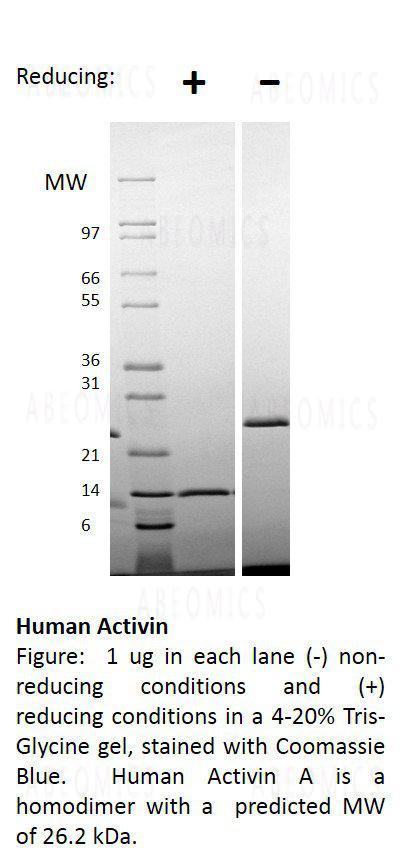 Activin A is a member of the transforming growth factor beta (TGF-beta ) family of proteins and functions to stimulate follicle-stimulating hormone (FSH) secretion. Activins are produced in many tissue types including the skin, gonads, lungs, and pituitary gland. Activins interact with receptor type I and type II serine/threonine protein kinases, to activate SMAD signaling and regulate diverse cellular functions, such as cell proliferation, differentiation, wound healing, apoptosis, and metabolism. Activin A is a homodimer comprised of two activin beta A chains. Cleavage of the N-terminal propeptide renders the Activin protein biologically active. Human Activin A shares 100% amino acid sequence identity with mouse, rat, porcine, bovine, and feline Activin A proteins.