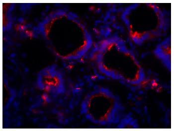 Figure 1: Chicken intestine tissue was stained with Mouse Anti-Chicken IgA-Biotin followed by Streptavidin-CY3 .