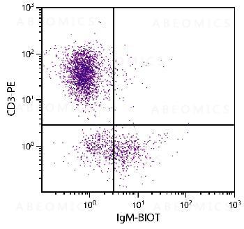 Figure 1: Chicken peripheral blood mononuclear cells were stained with Mouse Anti-Chicken IgM-Biotin and Mouse Anti-Chicken CD3-PE followed by Streptavidin-FITC .
