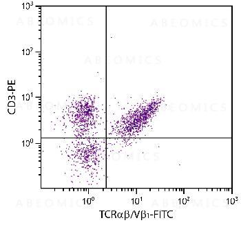 Figure 1: Chicken peripheral blood mononuclear cells were stained with Mouse Anti-Chicken TCRαβ/Vβ1-FITC and Mouse Anti-Chicken CD3-PE .