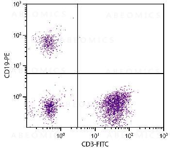 Figure 1: Human peripheral blood lymphocytes were stained with Mouse Anti-Human CD19-PE and Mouse Anti-Human CD3-FITC .