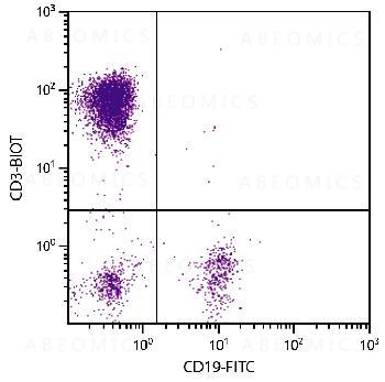 Figure 1: Human peripheral blood lymphocytes were stained with Mouse Anti-Human CD3-Biotin and Mouse Anti-Human CD19-FITC followed by Streptavidin-PE .