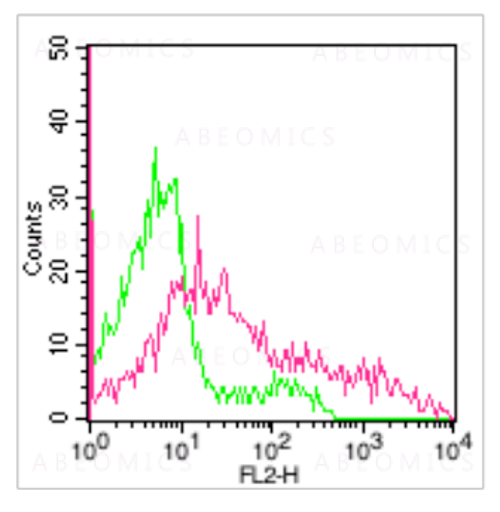 Figure 1: Cell surface FLOW staining of PBMC (monocytes gated). Green: Isotype control, Red: Cd36 (10-7666). 05 µg antibody was used. Goat anti-mouse PE conjugated secondary antibody was used.