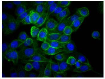 Figure 1: Human pancreatic carcinoma cell line MIA PaCa-2 was stained with Mouse Anti-Human CD44 followed by Donkey Anti-Mouse IgG(H+L), Human SP ads-FITC and DAPI.