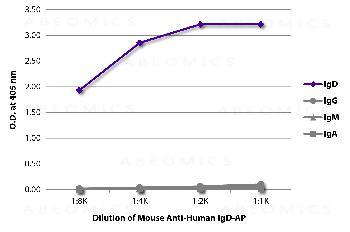 Figure 1: ELISA plate was coated with purified human IgD, IgG, IgM, and IgA. Immunoglobulins were detected with serially diluted Mouse Anti-Human IgD-AP .