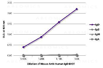 Figure 1: ELISA plate was coated with purified human IgD, IgG, IgM, and IgA. Immunoglobulins were detected with serially diluted Mouse Anti-Human IgD-Biotin followed by Streptavdin-HRP .
