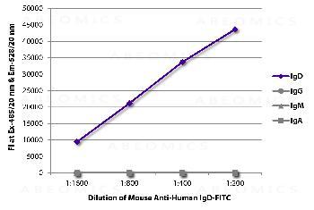 Figure 1: ELISA plate was coated with purified human IgD, IgG, IgM, and IgA. Immunoglobulins were detected with serially diluted Mouse Anti-Human IgD-FITC .