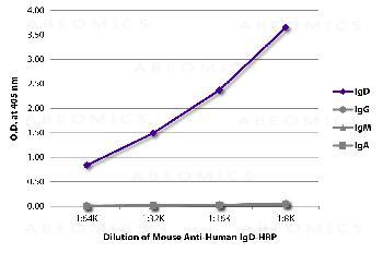 Figure 1: ELISA plate was coated with purified human IgD, IgG, IgM, and IgA. Immunoglobulins were detected with serially diluted Mouse Anti-Human IgD-HRP .