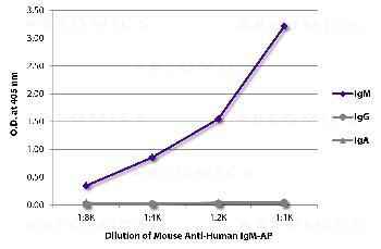 Figure 1: ELISA plate was coated with purified human IgM, IgG, and IgA. Immunoglobulins were detected with serially diluted Mouse Anti-Human IgM-AP .