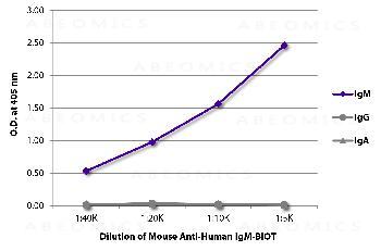 Figure 1: ELISA plate was coated with purified human IgM, IgG, and IgA. Immunoglobulins were detected with serially diluted Mouse Anti-Human IgM-Biotin followed by Streptavidin-HRP .