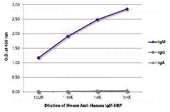 Figure 1: ELISA plate was coated with purified human IgM, IgG, and IgA. Immunoglobulins were detected with serially diluted Mouse Anti-Human IgM-HRP .