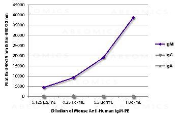 Figure 1: ELISA plate was coated with purified human IgM, IgG, and IgA. Immunoglobulins were detected with serially diluted Mouse Anti-Human IgM-PE .