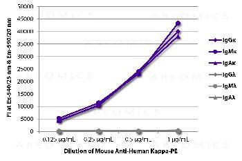 Figure 1: ELISA plate was coated with purified human IgGκ, IgMκ, IgAκ, IgGλ, IgMλ, and IgAλ. Immunoglobulins were detected with serially diluted Mouse Anti-Human Kappa-PE .