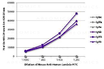 Figure 1: ELISA plate was coated with purified human IgGκ, IgMκ, IgAκ, IgGλ, IgMλ, and IgAλ. Immunoglobulins were detected with serially diluted Mouse Anti-Human Lambda-FITC .