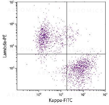 Figure 1: CD19 positive human blood peripheral lymphocytes were stained with Mouse Anti- Human Lambda-PE and Goat F(ab’)2 Anti-Human Kappa-FITC .