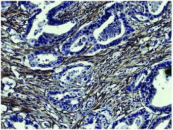 Figure 1: Human gastric cancer tissue was stained with Mouse Anti-Human MMP-2 followed by HRP conjugated Anti-Mouse Ig secondary antibody.