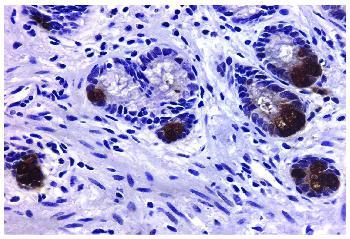 Figure 1: Human colon tissue was stained with Mouse Anti-Human MMP-9 followed by Goat Anti-Mouse IgG2a, Human ads-Biotin and Streptavidin-HRP .