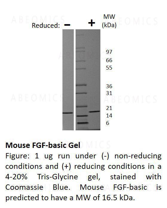 Biological Activity was determined by 3T3 cell Proliferation at <=ED50 <= 2.5 ng/mL (>= 4.0 x 10^5 units/mg) (typical ED50 is < 0.5 ng/mL). Centrifuge vial before opening, Suspend the product by gently pipetting the above recommended solution down the sides of the vial. DO NOT VORTEX. Allow several minutes for complete reconstitution. For prolonged storage, dilute to working aliquots in a 0.1% BSA solution, store at -80°C and avoid repeat freeze thaws. Upon reconstitution, a small amount of visible precipitate can be expected. A 10% overfill has been added to the total material vialed to compensate for this loss.