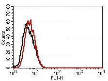 Fig-1: Cell surface flow analysis of FITC-conjugated Mouse IgG1 isotype control in THP-1 cell line using 2 µg/10^6 cells (Clone: MOPC31C). Black represents cell only; red represents mouse IgG1 isotype control conjugated with FITC.