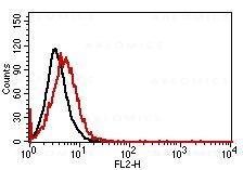 Fig-1: Cell surface flow analysis of Mouse IgG2a isotype control in Ramos cell line using 2 µg/10^6 cells (Clone: 231). Black represents cell only; red represents Mouse IgG2a isotype control. Goat anti-mouse PE conjugate was used as secondary antibody.