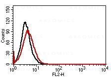 Fig-1: Cell surface flow analysis of Mouse IgG2b isotype control in Ramos cell line using 2 µg/10^6 cells (Clone: MOPC 11). Black represents cell only; red represents Mouse IgG2b isotype control. Goat anti-mouse PE conjugate was used as secondary antibody.