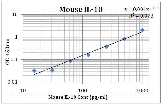 This assay employs an antibody specific for Anti-Mouse IL-10 coated on a 96-well plate. Standards and samples are pipetted into the wells and IL-10 present in a sample is bound to the wells by the immobilized antibody. The wells are washed and biotinylated anti-mouse IL-10 antibody is added. After washing away unbound biotinylated antibody, HRP-conjugated streptavidin is pipetted to the wells. The wells are again washed, a TMB substrate solution is added to the wells and color develops in proportion to the amount of IL-10 bound. The Stop Solution changes the color from blue to yellow, and the intensity of the color is measured at 450 nm.