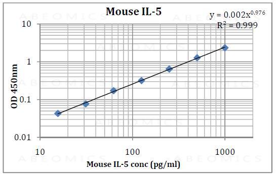 This assay employs an antibody specific for Anti-mouse IL-5 coated on a 96-well plate. Standards and samples are pipetted into the wells and IL-5 present in a sample is bound to the wells by the immobilized antibody. The wells are washed and biotinylated anti-mouse IL-5 antibody is added. After washing away unbound biotinylated antibody, HRP-conjugated streptavidin is pipetted to the wells. The wells are again washed, a TMB substrate solution is added to the wells and color develops in proportion to the amount of IL-5 bound. The Stop Solution changes the color from blue to yellow, and the intensity of the color is measured at 450 nm.