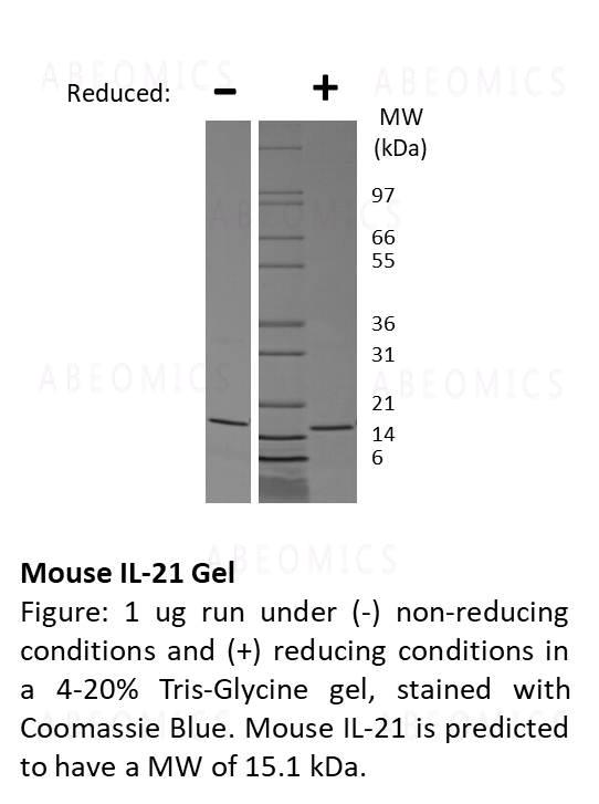 Interleukin 21 (IL-21) is a member of the common-gamma chain family of cytokines that are involved in immunoregulation. IL-21 is normally expressed by activated CD4+ T cells. The IL-21 receptor (IL-21R) activates the JAK/STAT signaling pathway and is expressed on T, B, and natural killer (NK) cells. Within the B cell lineage, IL-21 is a switch factor regulating IgG1 and IgG3 antibody production. IL-21 also cooperates with interleukin 4 (IL-4) for the production of multiple antibody classes in B cells. IL-21 has pleiotropic effects on the proliferation, differentiation, and effector functions of B, T, NK, and dendritic cells.