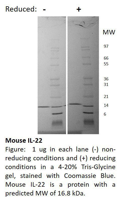 Interleukin 22 (IL-22), also called IL-TIF, is an IL-10 family member that is produced by activated dendritic cells and T lymphocytes.  IL-22 signals via a heteroduplex receptor consisting of IL-22R and IL-10RB chains.  IL-22 is a potent mediator of cellular inflammatory responses and wound healing. Â