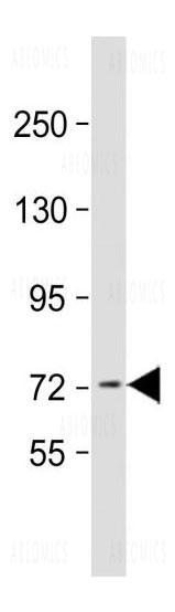 Figure 1: ACOX1 antibody (10-6537) at 1:1000 dilution + K562 whole cell lysates/proteins at 20 µg per lane. SecondaryGoat Anti-mouse IgG, (H+L), Peroxidase conjugated at 1/10000 dilution. Predicted band size : 74 kDa.