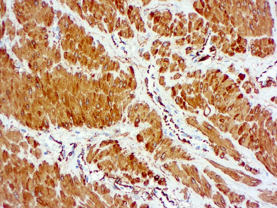 This antibody is specific to α-smooth muscle isoform of actin. It reacts with smooth muscle cells of vessels and different parenchymes. This antibody does not cross-react with β and γ-cytoplasmic, α-sarcomeric and α-myocardial actin isoforms.