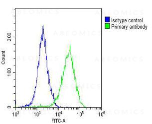 Figure 1: Overlay histogram showing A549 cells stained with ALDH1A1 Antibody (10-6536) (green line). The cells were fixed with 2% paraformaldehyde (10 min) and then permeabilized with 90% methanol for 10 min. The cells were then icubated in 2% bovine serum albumin to block non-specific protein-protein interactions followed by the antibody ( 1:25 dilution) for 60 min at 37°C. The secondary antibody used was Goat-Anti-Mouse IgG, DyLight® 488 Conjugated Highly Cross-Adsorbed at 1/200 dilution for 40 min at 37°C. Isotype control antibody (blue line) was mouse IgG1 (1μg/1x10^6 cells) used under the same conditions. Acquisition of >10, 000 events was performed.