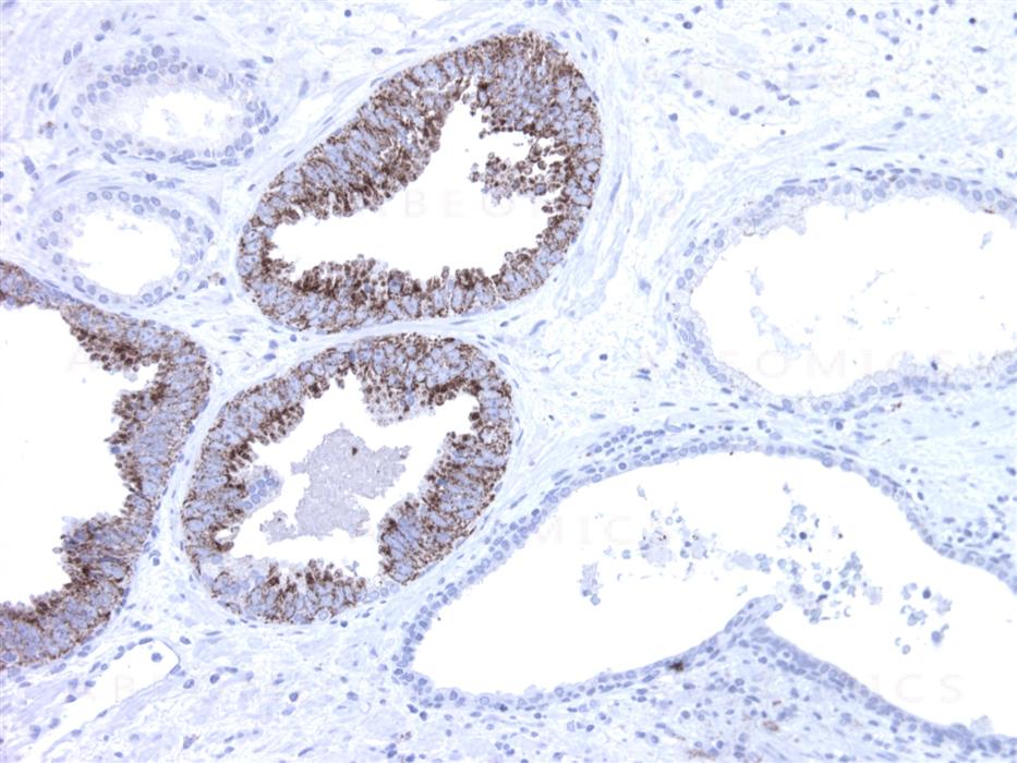 AMACR (alpha-methylacyl-CoA racemase) has been recently described as prostate cancer-specific gene that encodes a protein involved in the beta-oxidation of branched chain fatty acids. Expression of AMACR protein is found in prostatic adenocarcinoma but not in benign prostatic tissue. It stains premalignant lesions of prostate: high-grade prostatic intraepithelial neoplasia (PIN) and atypical adenomatous hyperplasia. AMACR can be used as a positive marker for PIN. Defects in AMACR are the cause of congenital bile acid synthesis defect type 4 (CBAS4); also known as cholestasis, intrahepatic, with defective conversion of trihydroxycoprostanic acid to cholic acid or trihydroxycoprostanic acid in bile. Clinical features include neonatal jaundice, intrahepatic cholestasis, bile duct deficiency and absence of cholic acid from bile.