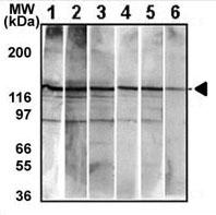 Figure 1: Detection of endogenous Met antibody (10-6501) in HepG2 cell line. 10 μg/lane of HepG2 cell lysate was used to examine the expression of human Met. Lanes 1-5 represent different anti-Met monoclonal antibodies and Lane 6 represents auto-phosohorylated-Met in HepG2 cell line detected by anti-phospho-Met Mab.