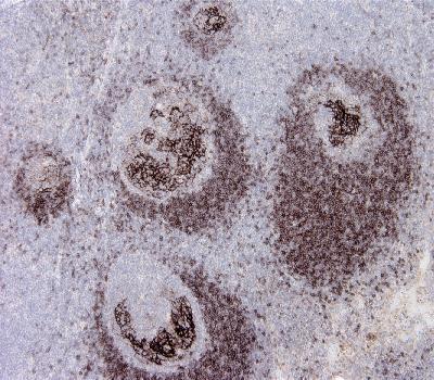 Figure-1: Tonsil (Figure-1 and Figure-2) has stained with CD23 (Clone: BS99) antibody using 1:200 dilution and pH9 tris-EDTA pretreatment. B-cells of mantle zone have strong or moderate membranous label and follicular dendritic cells stained strongly.