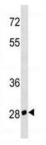 Figure 1: Western blot analysis of CD7 Antibody (10-6570) in K562 cell line lysates (35μg/lane). This demonstrates the CD7 antibody detected the CD7 protein.
