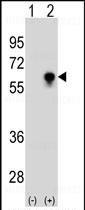 Figure 1: Western blot analysis of CDC25C Antibody (10-6557) with Lane 1: 293 cell lysates (2 μg/lane) either nontransfected or Lane 2: transiently transfected with the CDC25C gene.