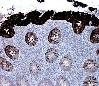 | Tissue Specificity: | Expressed predominantly in the intestinal epithelium. Expressed in luminal cells of colonic mucosa. Also expressed in the Merkel cells of keratinized oral mucosa; specifically at the tips of some rete ridges of the gingival mucosa, in the basal layer of the palatal mucosa and in the taste buds of lingual mucosa. |