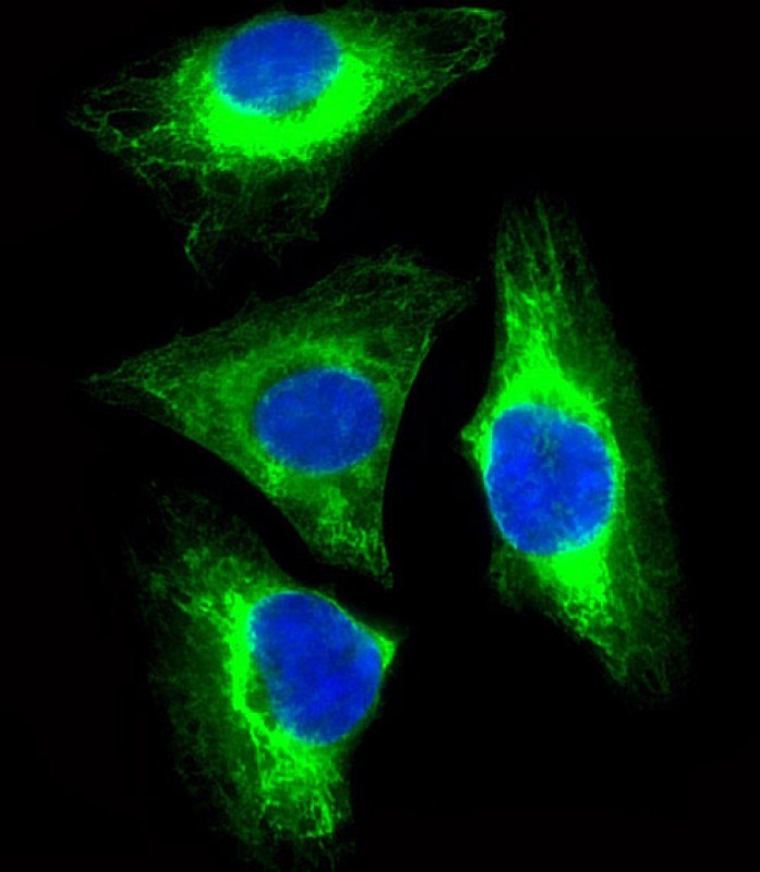 Figure 1: Immunofluorescent analysis of 4% paraformaldehyde-fixed, 0. 1% Triton X-100 permeabilized HeLa (human cervical epithelial adenocarcinoma cell line) cells labeling Pdx1 with CYK18 Antibody (10-6591) at 1/25 dilution, followed by Dylight® 488-conjugated goat anti-mouse IgG secondary antibody at 1/200 dilution (green). Immunofluorescence image showing cytoskeleton staining on HeLa cell line. The nuclear counter stain is DAPI (blue).