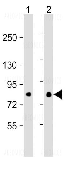 Figure 1: All lanes : Anti- EIF4B Antibody (10-6568) at 1:1000 dilution with Lane 1: A431 whole cell lysate, Lane 2: Hela whole cell lysates/proteins at 20 µg per lane. Secondary Goat Anti-mouse IgG, (H+L), Peroxidase conjugated at 1/10000 dilution. Predicted band size : 69 kDa.