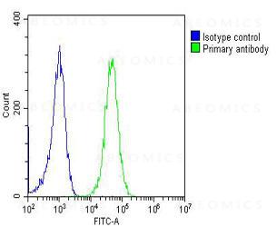 Figure 1: Overlay histogram showing Jurkat cells stained with Erk1/2 Antibody (10-6594) (green line). The cells were fixed with 2% paraformaldehyde (10 min) and then permeabilized with 90% methanol for 10 min. The cells were then icubated in 2% bovine serum albumin to block non-specific protein-protein interactions followed by the antibody (1:25 dilution) for 60 min at 37°C. The secondary antibody used was Goat-Anti-Mouse IgG, DyLight® 488 Conjugated Highly Cross-Adsorbed at 1/200 dilution for 40 min at 37°C. Isotype control antibody (blue line) was mouse IgG2a (1μg/1x10^6 cells) used under the same conditions. Acquisition of >10, 000 events was performed.